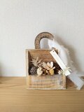 ショッパーズバッグをモチーフにしたこぶりな木製花器にドライフラワーや木の実をアレンジしました!