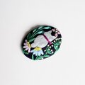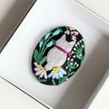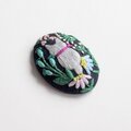 サーモンピンクの地に黒い花の刺繍、ありそうでなかったこの色のとりあわせ、すてきなブローチでした。