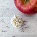 真っ白なりんごをイメージして、フェルト地にひと針ずつ丁寧にビーズ刺繍を施したブローチです。