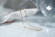 シンプルながら、存在感のあるクリップチェーンは、面の出るカットのチェーンの為、光を受け細かに煌めいてくれます。1本でも華やかさと上品さを併せ持つデザインとなっており、しっとりと素肌に馴染むチェーンは、デイリーなスタイリングをより魅力的に演出してくれます。