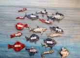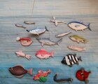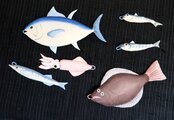 クロマグロ、カツオ、ヒラメ、真鯛、ハコフグ、石鯛、ヨシキリザメ、すずき、アンコウ、ホウボウ、ウナギ、サヨリ、ヤリイカ、トビウオ、イワシ2匹、キス