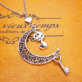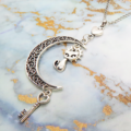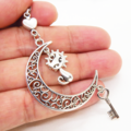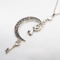 アンティークシルバー 猫とアラベスク調の透かし三日月を組合せたネックレス ハート 鍵 ムーン 大人可愛い アジャスター付