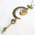 アンティークゴールド 猫とアラベスク調の透かし三日月を組合せたネックレス ハート 猫つき鍵 ムーン 長さ調整可 アジャスター付
