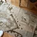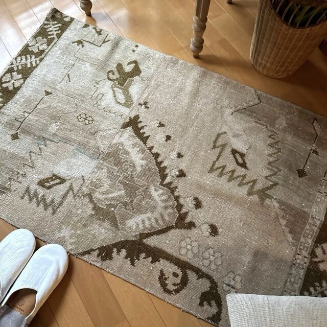 ・ヴィンテージラグは一点ものの手織物です。糸のほつれ、補修跡、色むら、毛羽立ち、小さなヨレやシミなどが見られる場合がございます。これらも含めて、唯一無二の風合いとしてお楽しみいただける方におすすめしています。