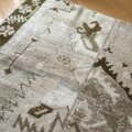 やさしいベージュと落ち着いたブラウンでまとめられた、ナチュラルな雰囲気がとても心地よいパッチワークラグです。ところどころに残る“ぽこぽこ”としたウールの風合いが可愛らしく、触れるとふんわりあたたか。ヴィンテージならではのくたっとした柔らかさも相まって、見た目も手触りもほっとする一枚です。