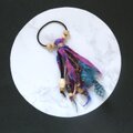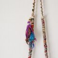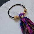 フェザー(羽飾り)やウッドビーズ・裂き布・シルク糸・ニット糸・革紐などを付けたハンドメイドのゴム飾りです。