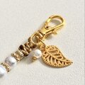 パールパーツをアクセントに、ゴールドとライトベージュのワックスコード2色を編み込んだ手編みマクラメレースのストラップです。リーフのパーツと小さなパールパーツが揺れて華やかな印象に♪