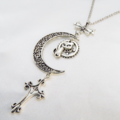 アンティークシルバー 猫とアラベスク調の透かし三日月のネックレス ロザリオ リボン ムーン アジャスター付 長さ調整可