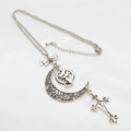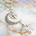 アンティークシルバーの可愛い猫のモチーフとアラベスク調の透かし模様の入ったオシャレな三日月を組合せたネックレスです