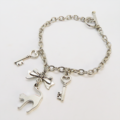 アンティークシルバー 跳ね猫シルエットモチーフとリボンに鍵が連なるブレスレット