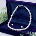 安心の日本製貝パールを使ったネックレスとお揃いのイヤーアクセサリー(ピアスもしくはイヤリング)の2点セットです。