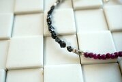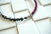 ルビー(ボタンカット型)とブラックダイヤモンド(ラフタンブル)をソフトタイプのワイヤーに通してつないでいったブレスレットです。