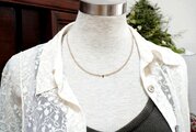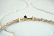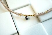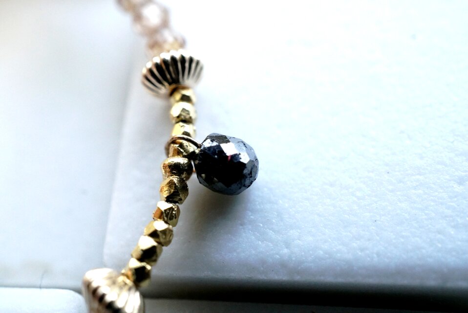 小さなブラックダイヤモンドはネックレス中央、1ミリ程度の小さなゴールドビーズを並べた個所に下げてあります。ネックレスは全体がゴールドと薄ベージュのお色目で、とても美しい佇まいかと思います。