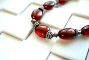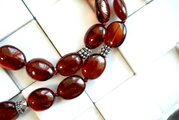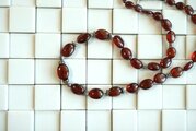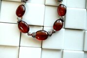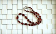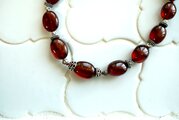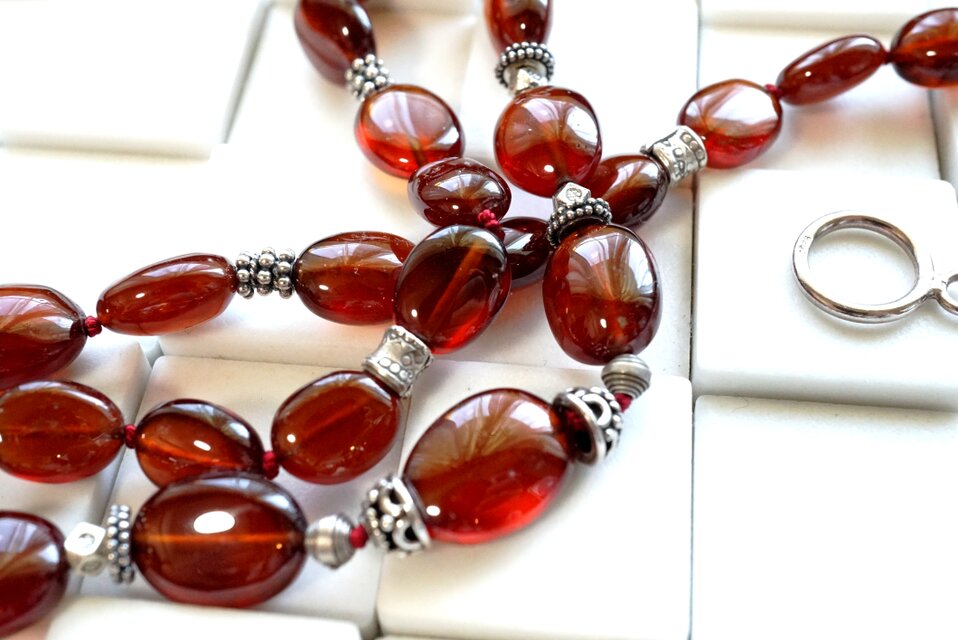オレンジがかった美しい赤がとても魅力的なヘソナイトガーネット(オヴァール型)をシルク糸でつないでいったネックレスです。
