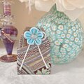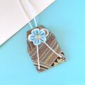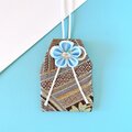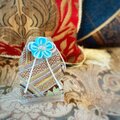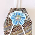 銀と金の光沢が織りなす幾何学模様に、水色のつまみ細工の花がそっと咲く