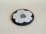 黒地に浮かぶ椿が愛らしく、味わい深い色味に銀の花芯が華やかさを添えています。