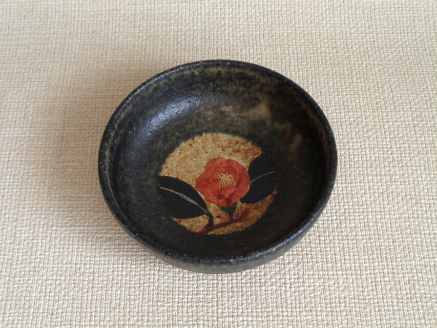 落ち着いた黒釉に華やかに描いた紅椿が映え、和の美しさと季節が感じられる作品です。