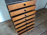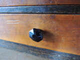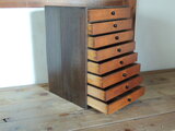 こちらの引出は補修箇所がございます。画像17にてご確認ください。また、上から五段目の引出内部と一番下の引出の取手部分に小さな欠けがございます。画像18と画像19にてご確認ください。(欠けは手を傷つけないようにやすりで丸くしてあります。)