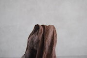 縦長のシルエット、表情のある裂き織り、均一でない柿渋染めの濃淡