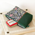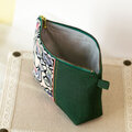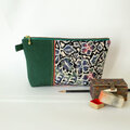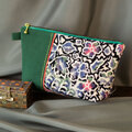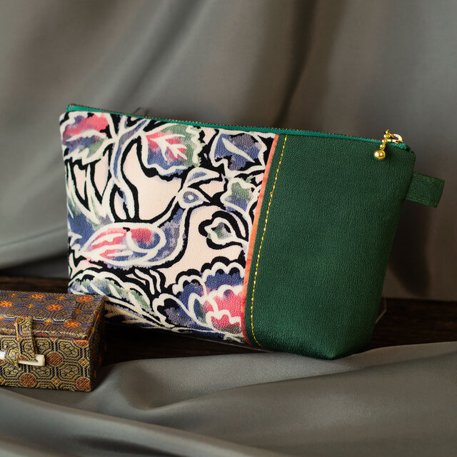 大島や他正絹紬・絣などを切り替えてオシャレに細いラインで締めました手作りポーチです。柄物の生地は表側で良い柄が出るようにしておりますので反対面は成り行きです。内袋は和柄の木綿地や胴裏・八掛などを使っています。細いラインは白大島を手染めでムラ染めにしたものをバイアステープに仕立てております。金茶ライン・赤ラインは正絹八掛をバイアスにしております。