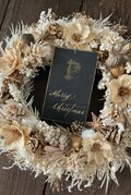 ティーツリーやストーベなど白い花材をベースに、ハンドメイドフラワーのアネモネやゴールドのどんぐり、スターアニスなどをアレンジしました。