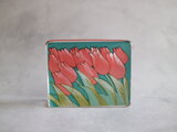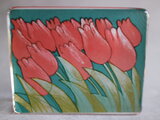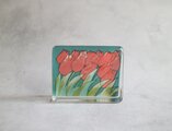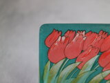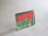 ガラスには生き生きと赤いチューリップが咲いており見ているだけで元気をもらえる作品です。ガラスの背面に絵の加工がされており透けるので、光がたくさん集まる窓辺のインテリアにおすすめのお品です。