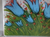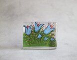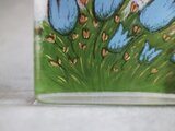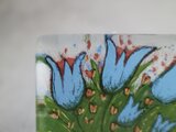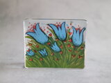 Kesäkukkia (夏に咲く花たち)というタイトルのお品で、青いチューリップ風の花々が描かれています。ガラスの背面に絵の加工がされており光を受けるたび、色のニュアンスがふわりと変わります。光がたくさん集まる窓辺のインテリアにおすすめのお品です。