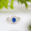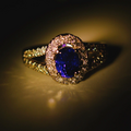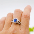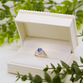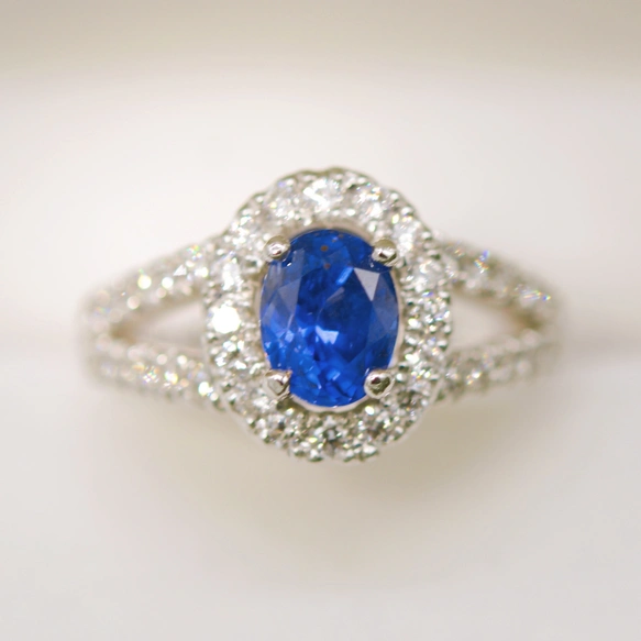 サファイアの周りやリングにはキラキラと輝きの良いダイヤモンドがセッティングされており、職人の手で1粒づつ石留めしています。