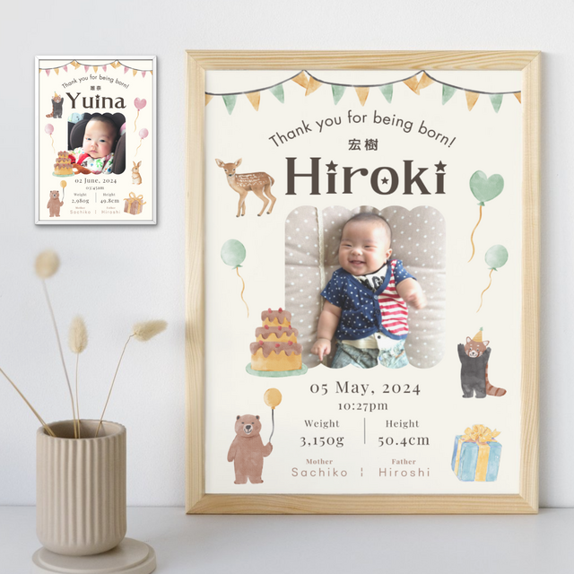 【データ納品】写真入り命名書ポスター (1人用)メモリアルベビーポスター / アニマル 出産祝い くま ケーキ うさぎ