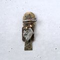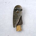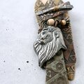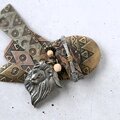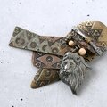 黒ずみ加工が施されたトライバル模様の色々な形の真鍮メタルにシルバーメタルのライオンとウッドボタンとビーズが付けられたアフリカンなデザインのヴィンテージブローチです。