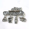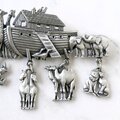 1935年にアメリカのロードアイランド州プロビデンスにて設立された「Jonette Jewelry Company」(通称J.J.、JJ)の船にサイ、馬、ラクダ、ライオンのチャームがぶら下がったシルバートーンのピューターのノアの方舟のヴィンテージブローチです。