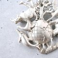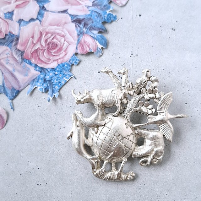1927年にアメリカにて創業したAmerican Jewelry Chain Company通称AJC(エージェイシー)のシルバーメタルの様々な動物達が地球を囲んだデザインのヴィンテージブローチです。