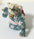こだわりの衣装: 身にまとう着物は、一針ずつ丁寧に編まれた手編みによるものです。鮮やかな色合いと細やかな柄が、作品にユーモアと芸術性を添えています。