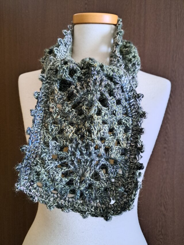 ひき揃えて深緑のモヘアのグラデーションの鍵編みのミニマフラーです。