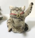 このキジトラ猫の招き猫は、高さ18cm、幅18cm、奥行き16.5cmの愛嬌のあるずんぐりとした体型に、作家独自のユーモアと技術を込めた一点物です。