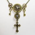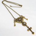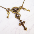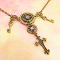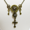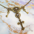 アンティークゴールド ロザリオと歯車の多重多層スチームパンク風ネックレス ゴシック 鍵 スワロフスキー 長さ調節可