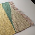 花の黄色とシルバーがかった葉をイメージした、綴れ織りで動きのある形のマットです。