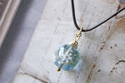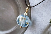 金箔を貼り付けた薄い水色の地に、雪の結晶を散りばめたとんぼ玉です。