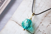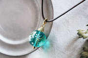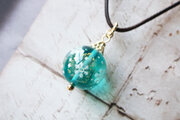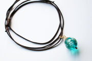 金箔を貼り付けたエメラルドグリーンの地に、雪の結晶を散りばめたとんぼ玉です。