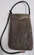 中綿を入れ、袋の口の片方に、藍大島紬の着物で作ったループをつけ、ループの先に、黒真珠と赤の筒を付けています。
