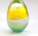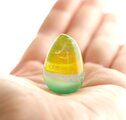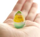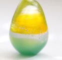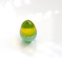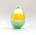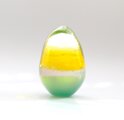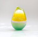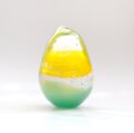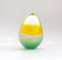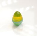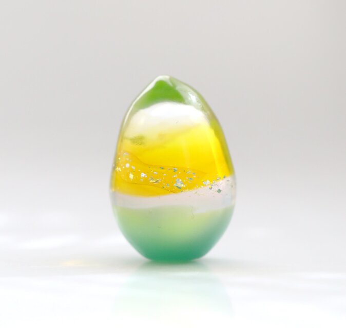柔らかな半透明のグリーンのガラスをベースに、可愛らしいピンクと黄色の透明なガラスを重ね合わせながら制作した雫型の小さなガラスオブジェです。