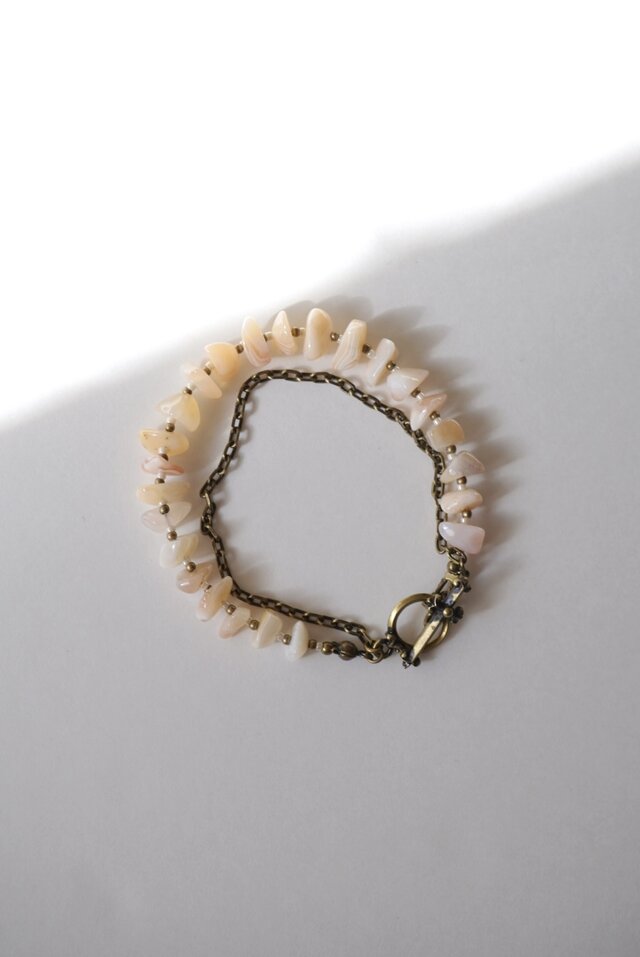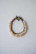 天然ピンクボツワナアゲートに真鍮チェーンを組み合わせた贅沢なブレスレットです。優しいピンク系のストーンに2種類のビーズを組み合わせ、チェーンを重ねることでこれからの季節にぴったりのボリューム感があります。