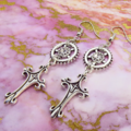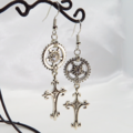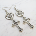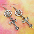 アンティークシルバー スチームパンク風デザインロザリオと歯車を組合せたピアス スワロフスキー サージカル可
