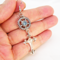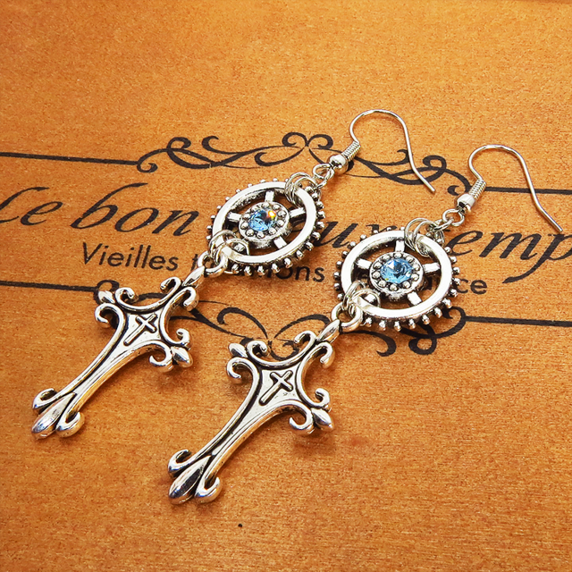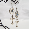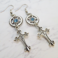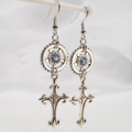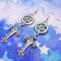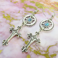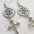 アンティークシルバー スチームパンク風デザインロザリオと歯車のピアス スワロフスキー アクアマリン サージカル可