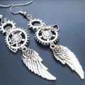 アンティークシルバー 歯車と翼を組合せたスチームパンク風ピアス オープンハート スワロフスキー サージカル可