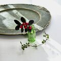 実は、刺繍糸でぷっくりした表情に仕立て、葉っぱは実を引き立てるように深く落ち着いた緑色に染めました。