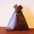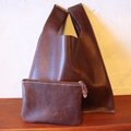 深いチョコブラウンに微細なシボとセミマットの艶。肉厚なのにしなやかで、結ぶだけで三角にきゅっと決まるノットデザイン。柔らかさと、底にたまるドレープが上質感を引き上げます。スマホ・長財布がゆとりで入り、同革ポーチ付きで荷物の整理もスマート。使うほど色艶が深まり、日常を凛と引き締める相棒に。