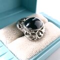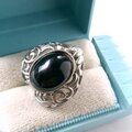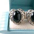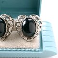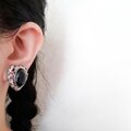 オープンワークのスワール模様が施されたアールヌーヴォーデザインのマットなシルバーメタルのハートにブラックに色付けされたプラスチックカボションがあしらわれたヴィンテージイヤリングです。