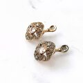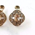 1927年ロードアイランドにて創業、1937年会社名を変更しアクセサリー制作を開始したMONET(モネ)の黒ずみ加工が施された菱形のオープンワークゴールドメタルにライトコロラドトパーズラインストーンがあしらわれたヴィンテージイヤリングです。