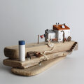 流木、ねじ・釘(赤錆加工)、ホワイトウッド(欧州スプルース、ドイツトウヒなど)、ステイン、ペンキ等で製作。ヤスリでダメージ感を演出しています。「潮騒とカモメの鳴き声、風の音」を感じていただければ幸いです。